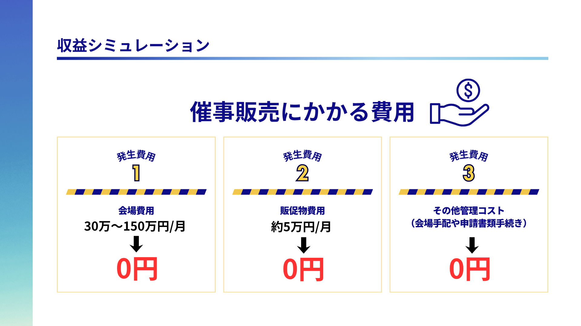 | サポート体制 | ■営業研修・商材研修 ■催事備品の提供 ■営業ツール・ノウハウの共有 ■動画サイトを用いトークや表情・振る舞いなどがいつでも勉強できる環境 ■初回の研修以外に定期的に営業研修あり ■強力バックオフィスによる素早い対応 |