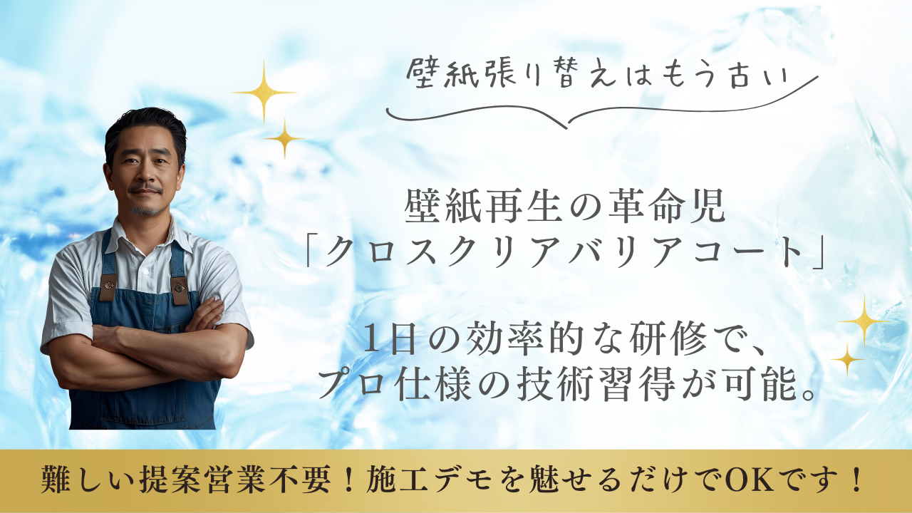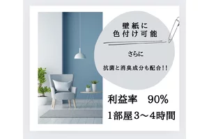 | サービス概要 | 壁紙を張り替えずに新品同様に再生させる壁紙塗り替えサービスです! <国土交通省も推奨> 賃貸マンションや宿泊施設、介護施設など「お部屋の数」が年々急増しています! 原状回復の需要が高まる中、格安&短時間で施工できる「壁紙塗替え」が注目を集めています。 <物価高騰に左右されない> 壁紙資材の高騰により、「張り替え」の値段も高騰。 それに比べ「クロスクリアバリアコート」は原価率10%、利益率90%をキープ! 張り替えの半額で提供したとしても同等の利益を残せるのが強みです。 <経験も営業力も一切不要> 簡単施工なので老若男女問わず未経験者様も安心! ご契約いただいている半数以上が未経験! 1日で技術と集客のノウハウを完全習得!もちろん開業後のサポートも◎です。 |