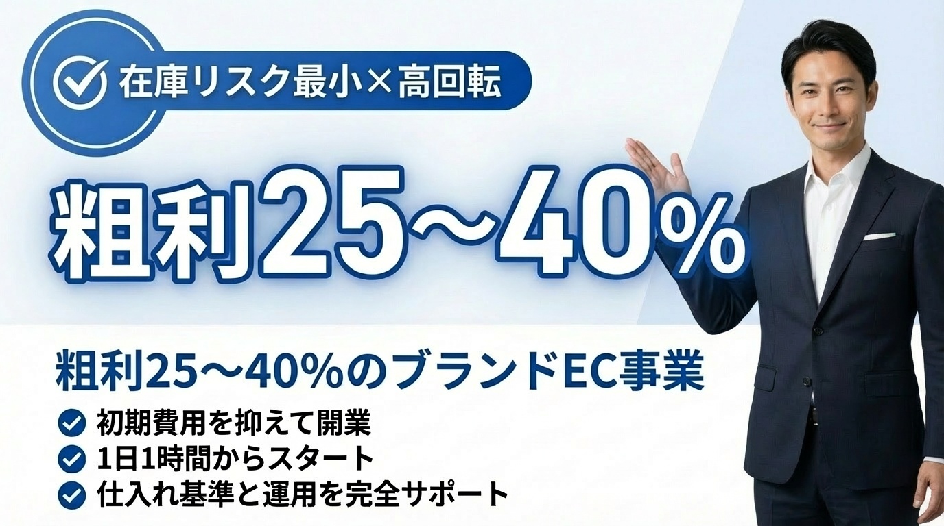 在庫リスクを最小限に抑えつつ、粗利25〜40%を狙える高回転型ブランドEC事業をご提供します。