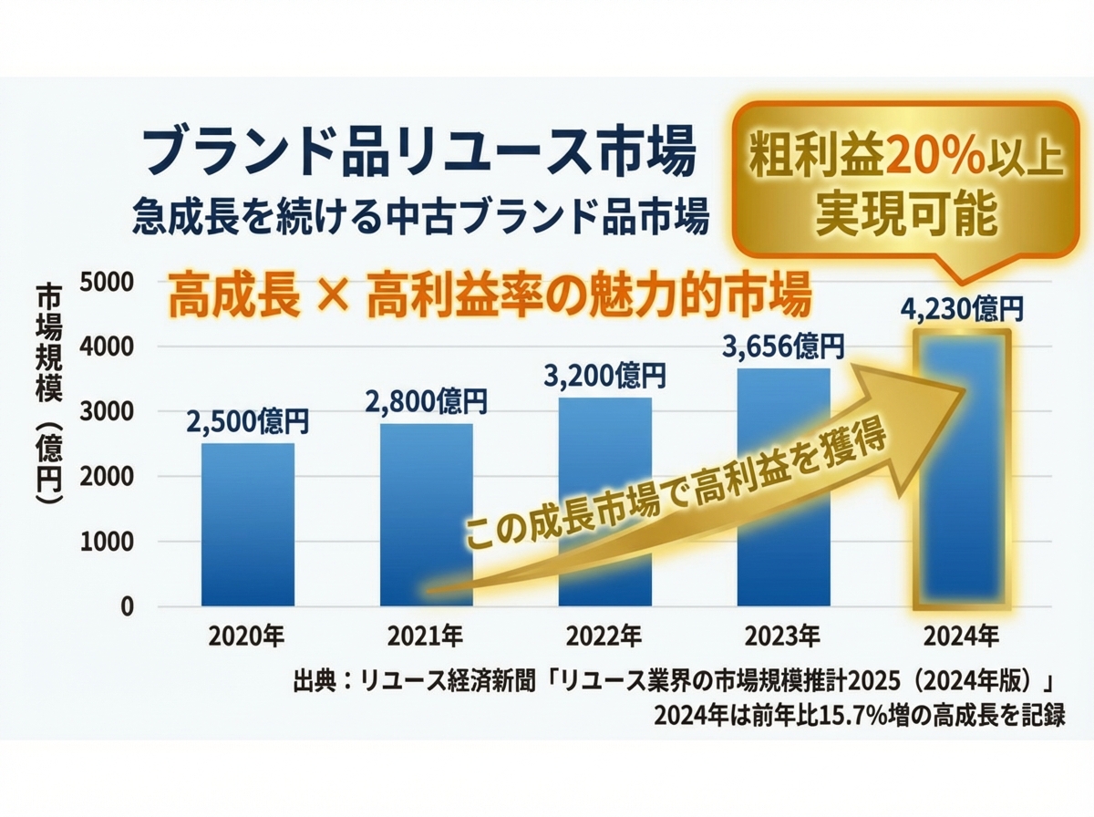 | 市場性 | 中古ブランド市場は世界的に拡大しており、2023年約3.4兆円から2029年には約6.0兆円規模へ成長すると予測されています(年平均成長率約10%)。 物価高やサステナブル志向、海外需要の拡大を背景に、景気変動の影響を受けにくい安定した成長市場として注目されています。 |