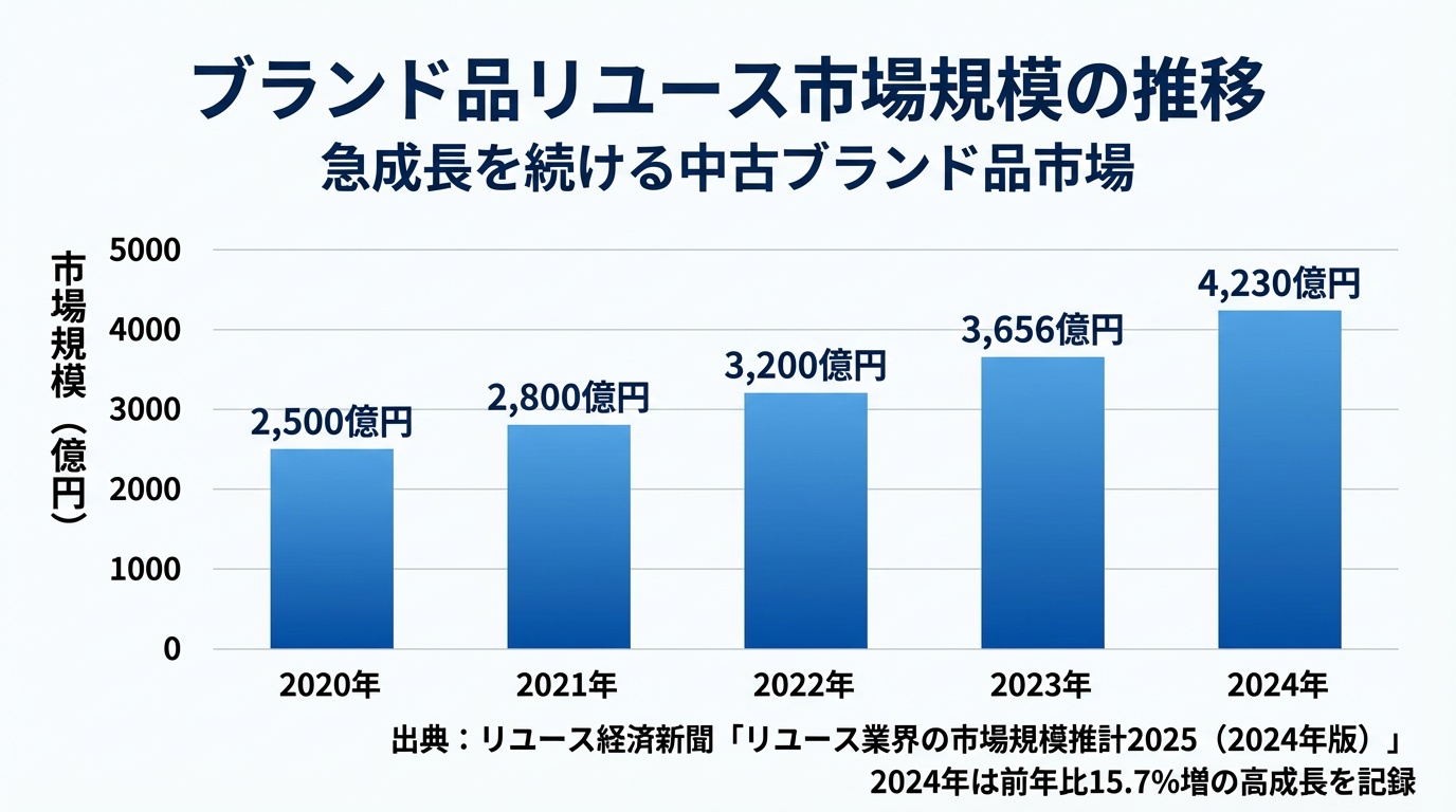 ブランド品リユース市場は年々拡大しており、物価高や海外需要の影響で需要が落ちにくい成熟市場でもあります。